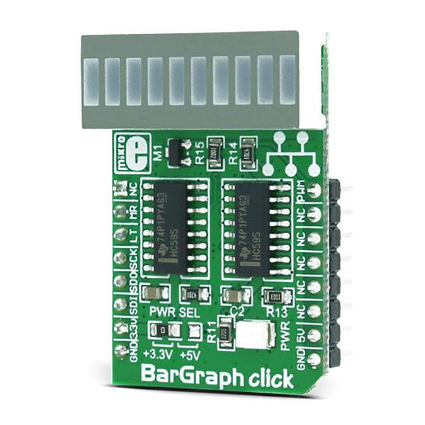 The Bargraph Click Board™ communicates with the host MCU via the mikroBUS™ SPI interface pins. Two bytes of information (16 bits in total) are pushed through the serial data input pin (DS) of the first 74HC595 IC, routed to the SDI pin. The 74HC595 construction is such that after receiving 8 bits, clocking in one more bit will shift the existing 8 bits by one place, overflowing the last bit to the Q7S output pin, shifting it out that way. Since the Q7S of the first 74HC595 is connected to the DS pin of the second 74HC595, clocking 16 bits into the first 74HC595 IC will fill up both ICs with required data. Note that only two bits of the second byte will be used, since the second shift register only has 2 output connected to the bar graph display (8 from the first IC + 2 from the second).