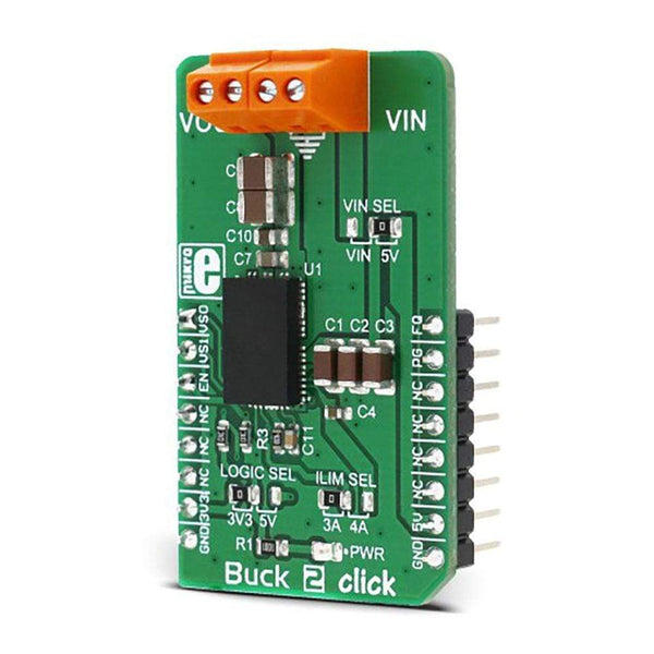 Key Features | The Buck 2 Click Board™ features a wide range of input voltages, pin configurable working parameters, internal soft start, thermal shutdown, hiccup mode short-circuit protection and high switching efficiency |