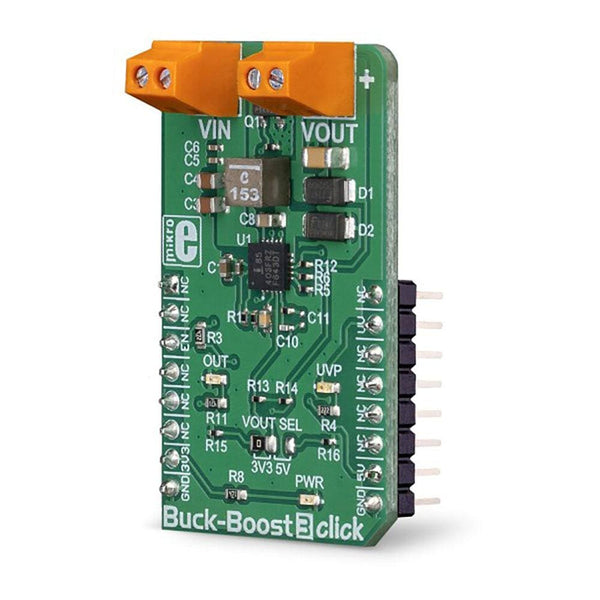 Featuring both buck and boost functionality on one device, while maintaining an accurate voltage at the output, even with heavier loads, this Click board™ can be used to provide continuous power in cases when the input voltage fluctuates a lot, in the range from 2.5V up to 35V.