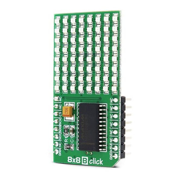 The 8x8 B Click Board™ is a 64 LED matrix display Click board™, composed of SMD LEDs organized in 8 rows by 8 columns. It has a digital brightness control in 16 steps, it can control every LED in the display matrix independently, it blanks the display on power up to eliminate glitches and it requires a single resistor to control the current through all the LEDs at once, which simplifies the design. 8x8 B click uses a fast SPI communication protocol, allowing fast display response and no lag.