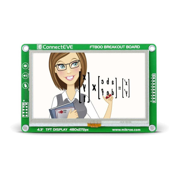 The ConnectEVE board features a 4.3" TFT colour display with 480x272 pixel resolution, driven by an HX8257A display controller capable of showing unparalleled graphical content. It can easily drive TFTs even with 8-bit microcontrollers.