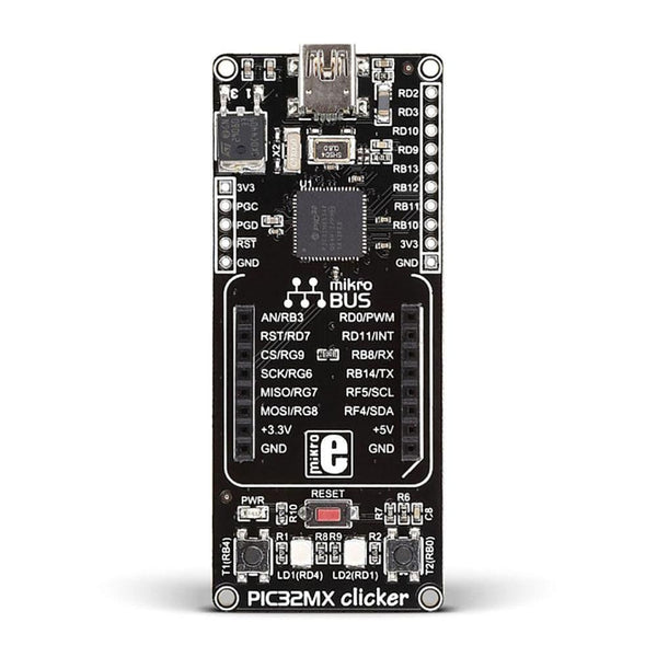 The PIC32MX Clicker Board™ brings flexibility of Click add-on boards to your favourite microcontroller, making it a perfect starter kit for implementing your ides.