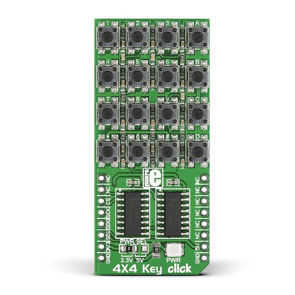Inputs are read by a pair of connected 8-bit parallel-in serial-out shift registers — allows for multiple key presses at the same time. For ease of use, each button has silkscreen markings. The right-most column is marked with letters A-D, the other 12 buttons are marked like a telephone keypad. The board is designed to use either a 3.3V or 5V power supply.