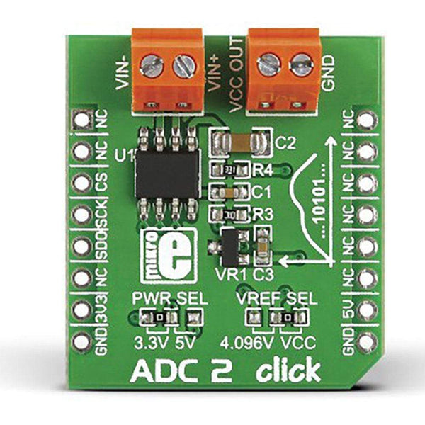 The ADC 2 Click Board™ carries MCP3551/3, which is a 22-bit ADC with automatic internal offset and gain calibration. This high precision analog-to-digital converter has total unadjusted error of less than 10 ppm, and low-output noise of 2.5 µV RMS. The board carries two pairs of screw screw terminals: VIN- for bringing in reference voltage, VIN+ for the positive voltage. VCC out and GND are output voltages. The click communicates with the target board through mikroBUS CS, CSK and MISO lines. Can use either a 3.3V or 5V power supply.