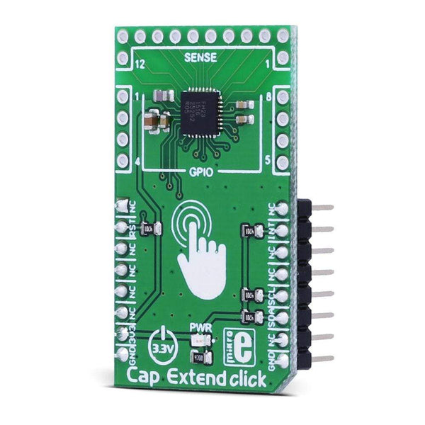 The Cap Extend Click Board™ is a mikroBUS add-on board with a SEMTECH SX8633 low power, capacitive button touch controller. It has 12 pins for connecting capacitive inputs (either touch-buttons or proximity sensors). Any sort of conductive object can be used as an input. Additional 8 GPIO pins, available on the side-edges of the board, can be used as LED drivers. The SX8633 IC integrates a 10 bit ADC – a resolution high enough to support a wide variety of touch pad sizes and shapes to be used with the click.