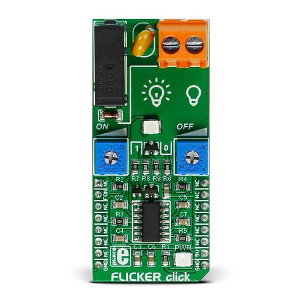 The FLICKER Click Board™ is the perfect, simple solution if you need to turn a device on and off at specific time intervals, like blinking LED commercials, alarm system lights, or any other signaling lights.