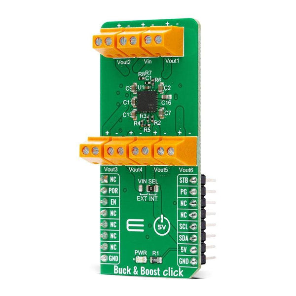 The Buck-Boost Click Board™ completely powers itself from the VIN external power supply terminal. Once the power is applied to the VIN terminal, the circuit also has to be enabled by setting the RUN pin routed to the RST pin of the mikroBUS™ socket to a high logic level. This will power up the converter, which will be indicated by the PWR LED indicator. It also includes additional features such as a power-good output with a Power Good LED indicator labelled as PGOOD that pulls to the ground when FB drops too far below its regulated voltage. This pin also can sink up to the absolute maximum rating of 15mA when set low.