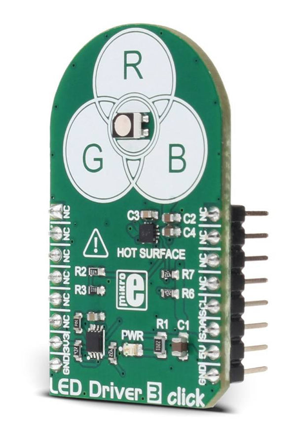 | Key Features | The LED Driver 3 Click Board™ features an integrated circuit with three independent LED driver sections and a programmable gradual dimming control, which gives a smooth dimming effect. It can display 32768 different colors. |