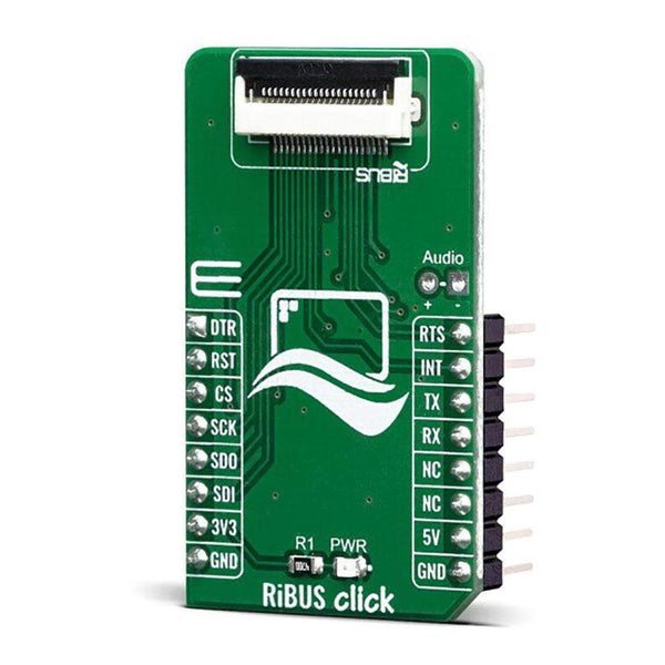The RiBUS Click Board™ offers standardized 20-pin FPC connector for display connection, as well as 2 pins for connecting an external audio device. This Click board™ offers a reliable and fast connection between a Riverdi display and the development system, allowing any system equipped with the mikroBUS™ to harness the graphical power of Riverdi displays.