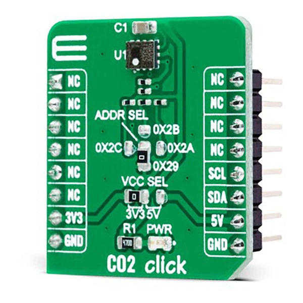 The CO2 Click Board™ can operate with both 3.3V and 5V logic voltage levels selected via the VCC SEL jumper. This way, it is allowed for both 3.3V and 5V capable MCUs to use the I2C communication lines properly. However, the Click board™ comes equipped with a library containing easy-to-use functions and an example code that can be used, as a reference, for further development.