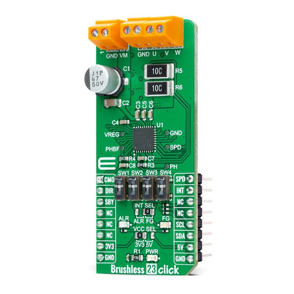 The Brushless 23 Click Board™ is realized using six N-channel MOSFETs, the SSM6K513NU also from Toshiba Semiconductor, two for each of the three phases. Using these FETs, capable of handling 15A, allows low power dissipation when driving 5A BLDC before hitting the output current limit threshold, used to restrain the current flowing to the motor. It also supports an external power supply for the motor, which can be connected to the input terminal labelled as VM and should be within the range of 11V to 27V, while the BLDC motor coils can be connected to the terminals labelled as U, V, and W.