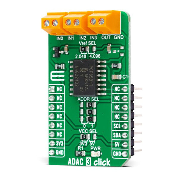 The ADAC 3 Click Board™ as its foundation uses the PCF8591, a low-power CMOS data acquisition device from NXP Semiconductors. The PCF8591 comes with four analog inputs configurable as single-ended or differential inputs used to measure voltages, alongside one analog output representing an 8-bit digital-to-analog converter. In addition to measuring voltage, the user can create them as desired and even use DAC and ADC together to generate an input to a circuit and measure the results with the ADC, making it suitable for various control, monitoring, or measurement applications. By its internal structure, the PCF8591 also consists of an analog input multiplexing circuit, an on-chip track and hold function, alongside a serial interface block.