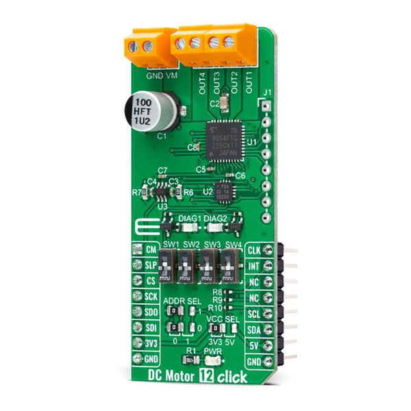 The DC Motor 12 Click Board™ can operate with both 3.3V and 5V logic voltage levels selected via the VCC SEL jumper. This way, it is allowed for both 3.3V and 5V capable MCUs to use the communication lines properly. However, the Click board™ comes equipped with a library containing easy-to-use functions and an example code that can be used, as a reference, for further development.