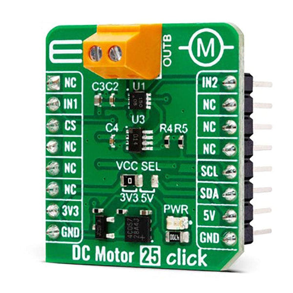 Th DC Motor 25 Click Board™ can operate with either 3.3V or 5V logic voltage levels selected via the VCC SEL jumper. This way, both 3.3V and 5V capable MCUs can use the communication lines properly. However, the Click board™ comes equipped with a library containing easy-to-use functions and an example code that can be used, as a reference, for further development.