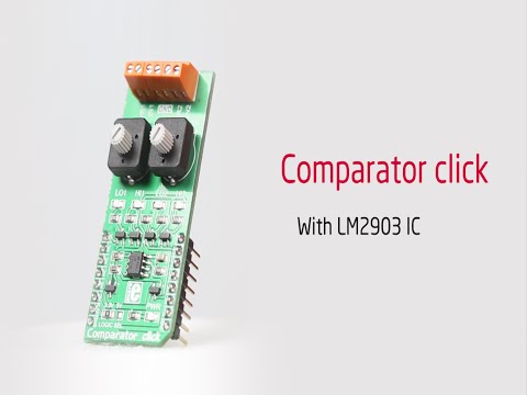The Comparator Click Board™ from MikroElektronika is a voltage comparator on a Click Board™ add-on board carrying an LM2903 precision voltage comparators. This LM2903 IC features two independent voltage comparators, two pairs of screw terminals (additional two screw terminals are for GND connections), and two potentiometers.