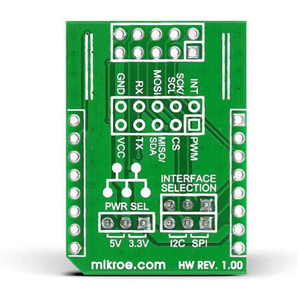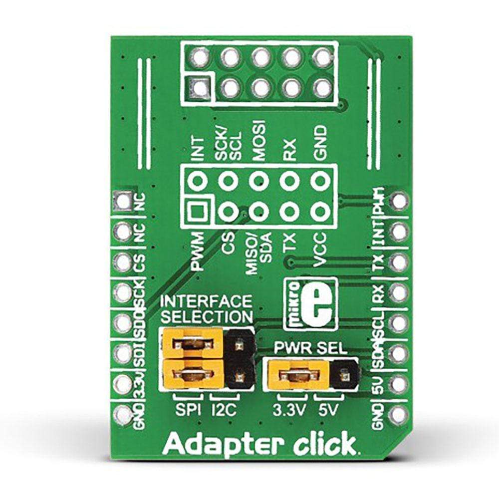 Adapter Click Board™ features two jumpers: one for communication interface selection between SPI or I2C and other is to choose between 3.3V or 5V power supply.
