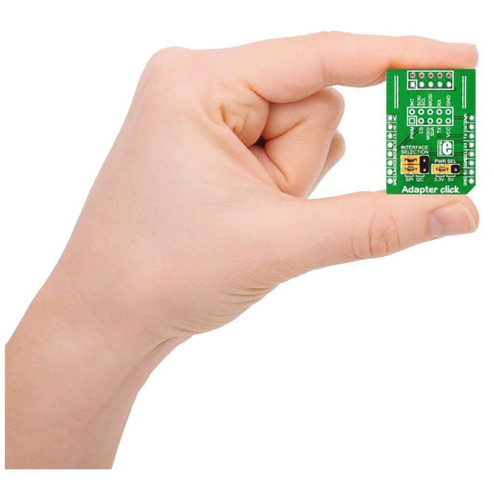 The Adapter Click Board™ has two jumpers: one for SPI/I2C selection and another one for the selection of power supply range. Adapter Click Board™ is designed to use a 3.3V or 5V power supply. Adapter Click Board™ communicates using MikroBUS.