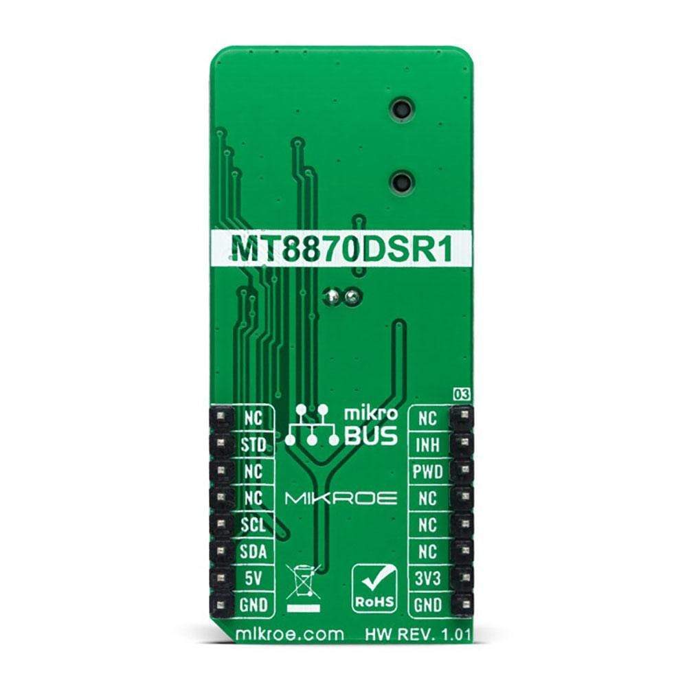The DTMF Decoder Click Board™ is based on the MT8870D, an integrated DTMF receiver with enhanced sensitivity from Microchip Technology. It offers low power consumption and high performance and consists of a band split filter section, which separates the high and low group tones, followed by a digital counting section that verifies the received tones' frequency and duration before passing the corresponding code to the output bus.