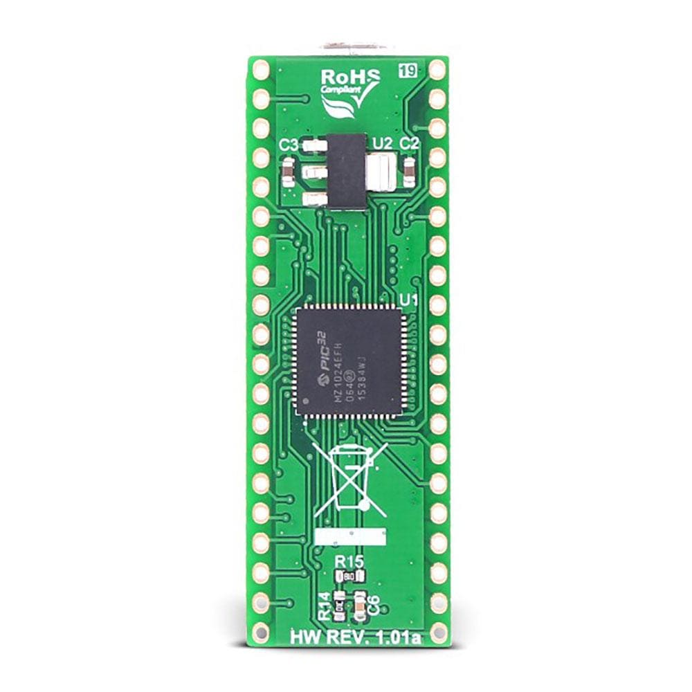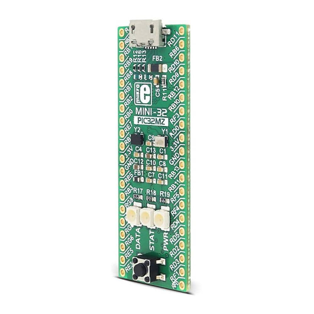 The MINI-32 for PIC32MZ is a small PIC32 development board containing the PIC32MZ microcontroller (1 MB Live-Update Flash and 512 KB SRAM) with FPU from Microchip.