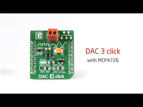 The DAC3 Click Board™ carries Microchip's MCP4726 IC, a 12-bit digital-to-analogue converter, along with voltage output screw terminals. The digital value is converted to the appropriate voltage level in the range between GND and Reference.