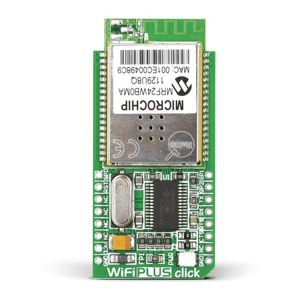 The WiFi PLUS Click Board™ is a compact solution for adding WiFi communication to your project. The click features MRF24WB0MA – 2.4GHz, IEEE std. 802.11 - compliant module from Microchip, as well as MCW1001 companion controller with on-board TCP/IP stack and 802.11 connection manager.