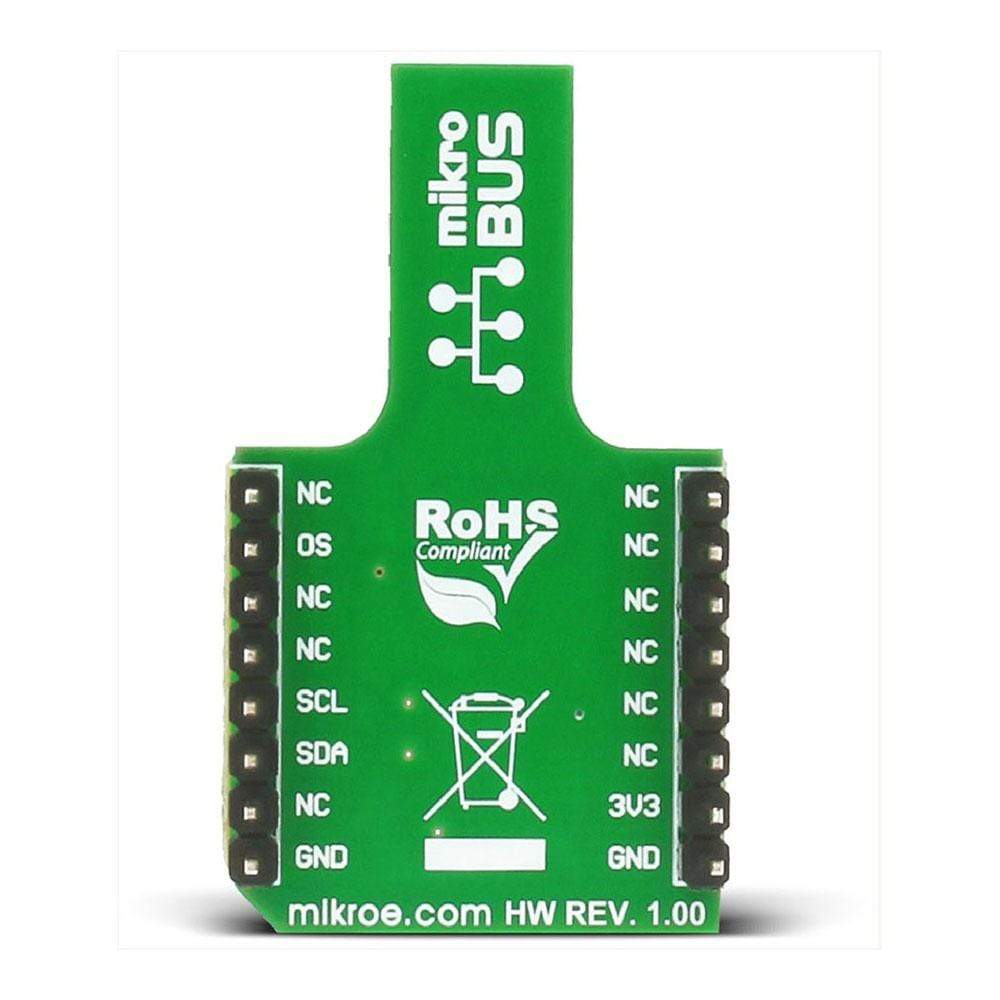 The Fever Click Board™ exposes the I2C interface and the OS pin on the mikroBUS™, making it very simple to use. I2C pins are routed to the appropriate I2C pins of the mikroBUS™, equipped with the required pull-up resistors. The OS pin is also an open drain output, which can work in two modes: it can be used as the interrupt, or as the thermostat/comparator.