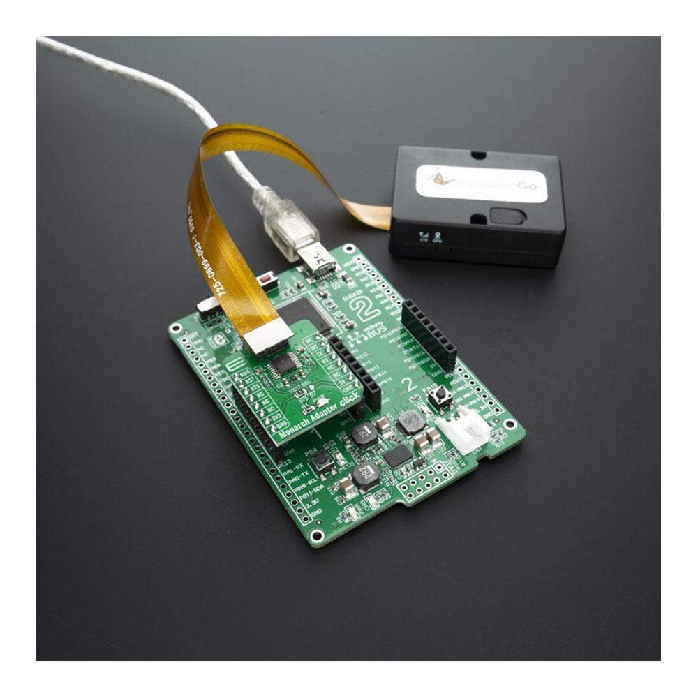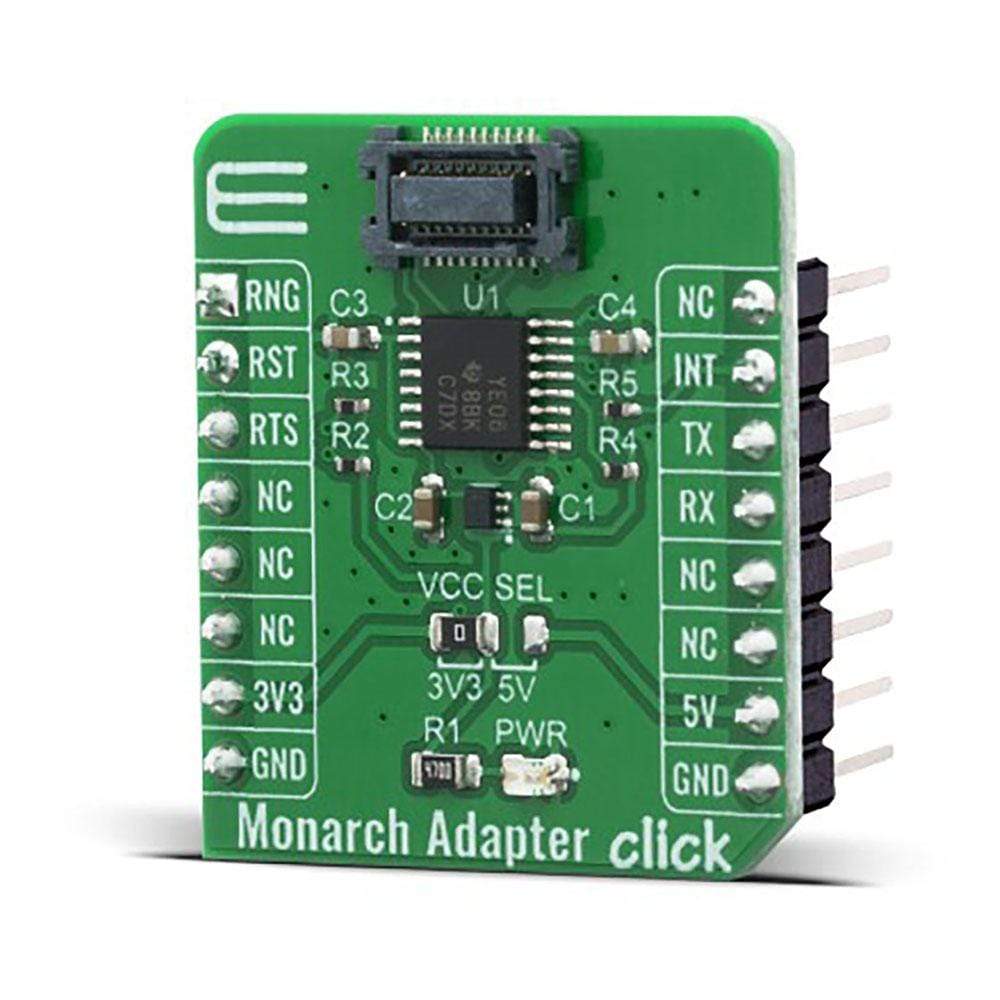 The Monarch Adapter Click Board™ is supported by a mikroSDK compliant library, which includes functions that simplify software development. This Click Board™ comes as a fully tested product, ready to be used on a system equipped with the mikroBUS™ socket.
