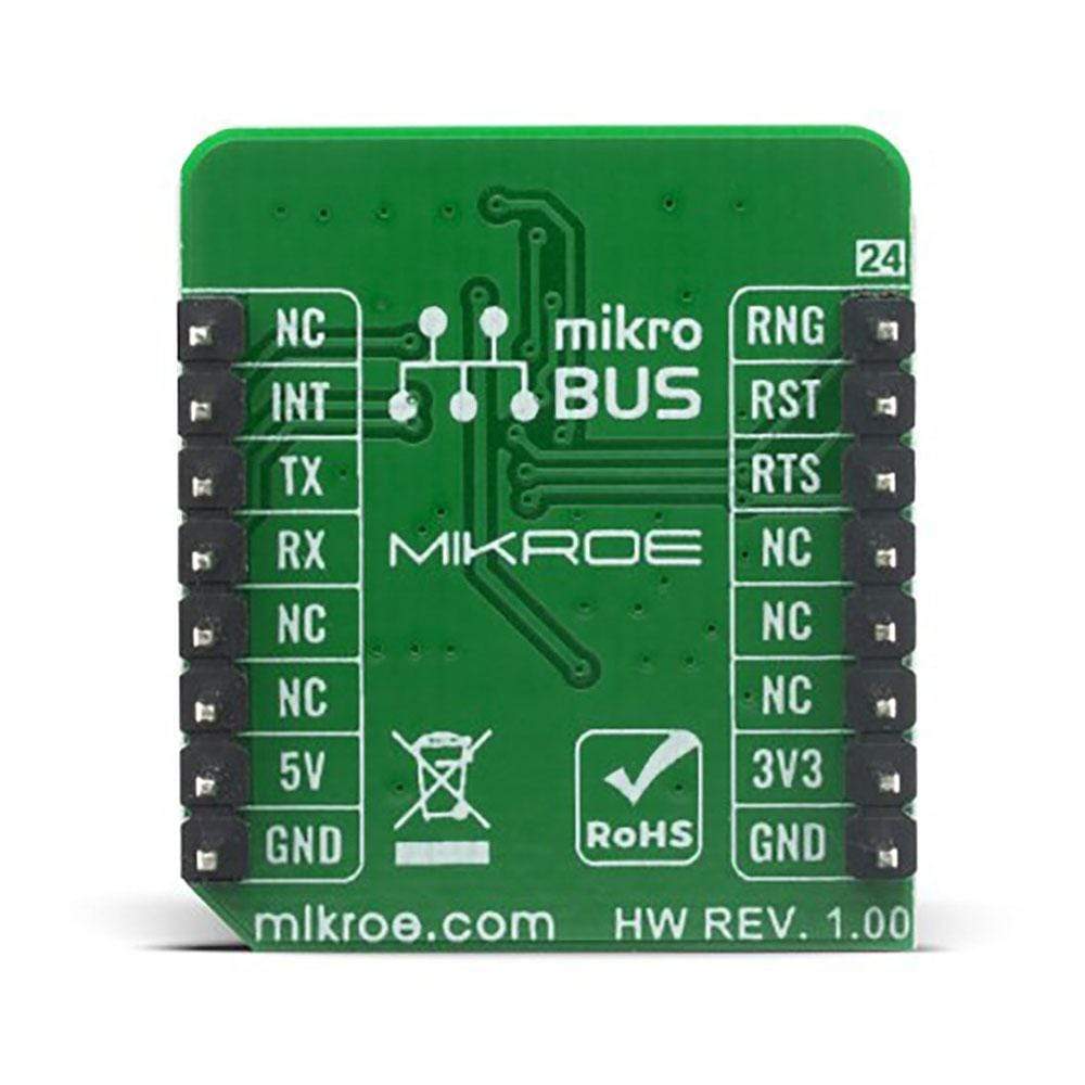 The Monarch Adapter Click Board™ is intended to help customers to successfully integrate and test their application based on Monarch Go. This Click adapter communication with your device through a serial UART interface and can exchange data with a cloud server using Verizon LTE network. The UART and GPIO pins of Monarch Go LTE-M modem is connected to one side of the level shifter, while the other side (Shifted) is connected to the respective mikroBUS™ UART and GPIO pins. However, the Monarch Go LTE-M modem series module is designed as the traditional DCE device (Data Communication Equipment) offering the full UART pin count, including the hardware flow control pins (CTS, RTS). These pins are routed to the mikroBUS™ CS (RTS) and the INT pin (CTS) and can be used in the MCU software if the hardware flow control is needed.